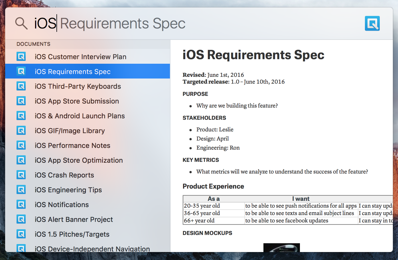 On the Mac version of the app, all your Quip documents show up in Spotlight Search. When you're searching your computer, all your team's collaborative documents will show up side-by-side with your personal files. It's a really cool experience — when you sign into Quip Desktop, all your team's knowledge is indexed and instantly searchable on your computer.