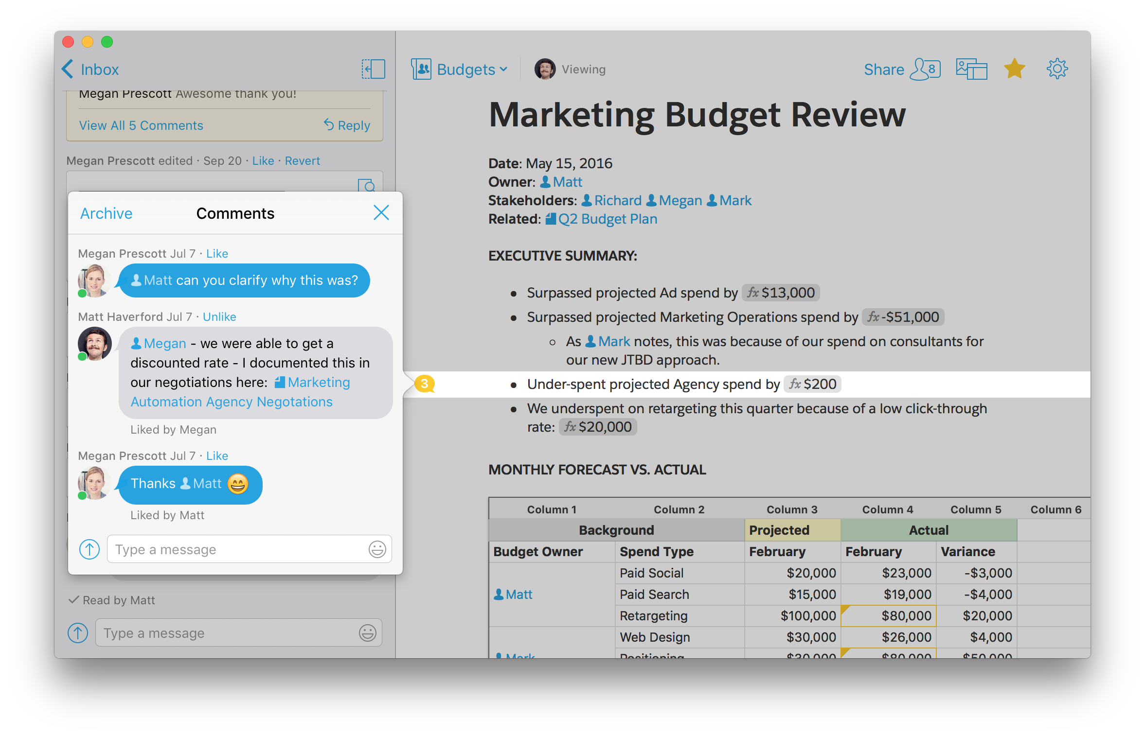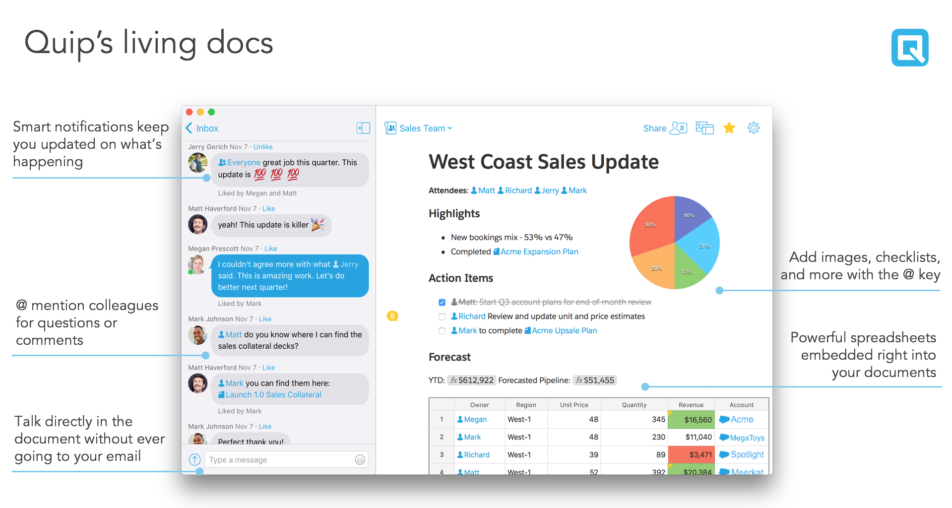 Since Quip documents have the communication built right in, you don't need to jump over to chat or email to see what's going on. Key decisions live in context right alongside your work, instead of buried in a 30-email thread. You can use @ mentions to assign tasks, or get a specific teammate's attention for questions or edits. Plus, you never have to worry about who's working on which version of a document or spreadsheet — every Quip doc is always up to date, with a full history of changes. Eventually you'll find that your team is more in sync, which means fewer meetings for check-ins and status updates.