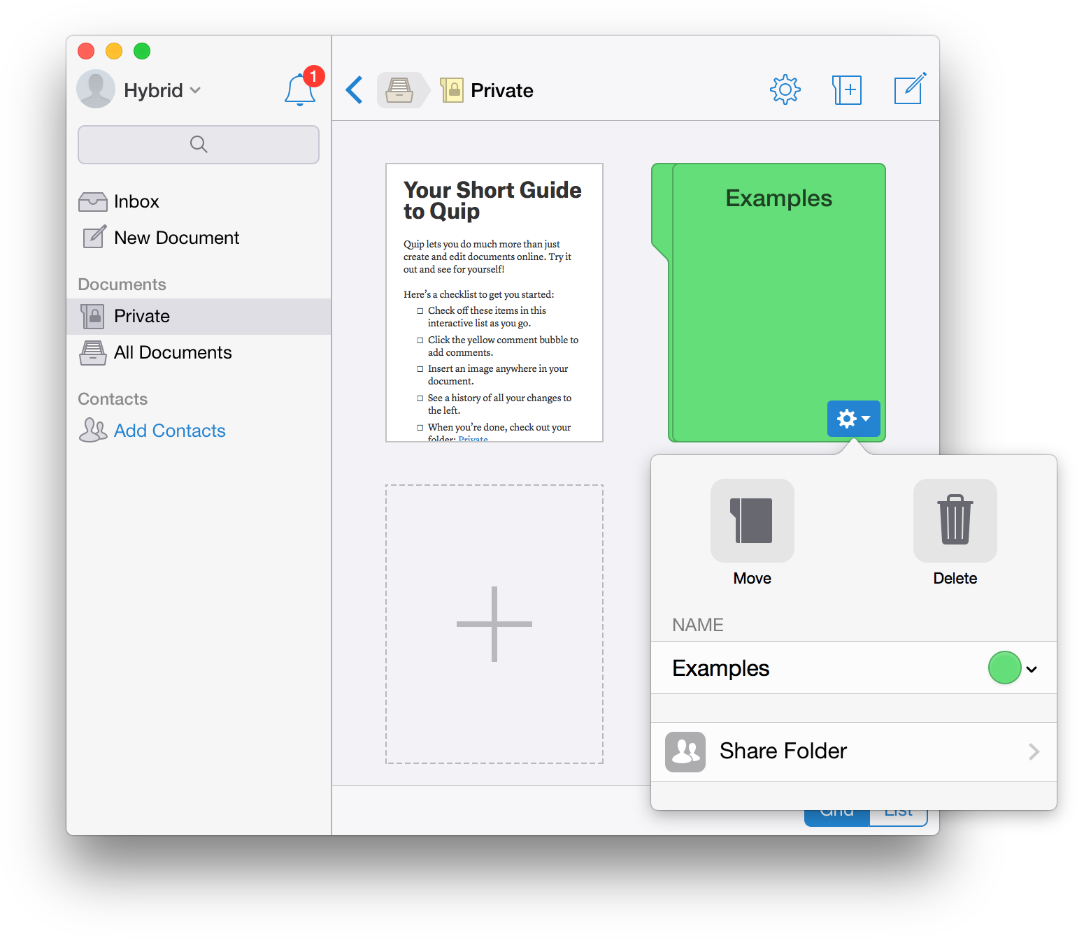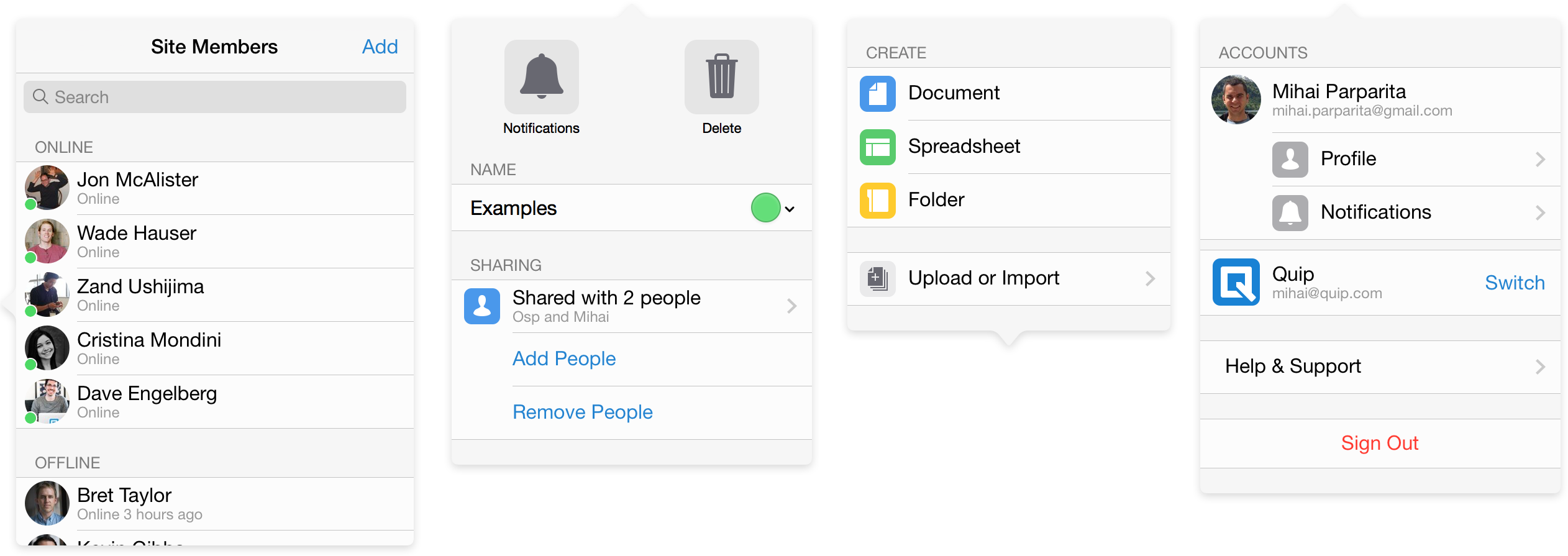 In addition to all these widgets popovers also often had custom validation logic (e.g. the “Create” button in the “New Folder” popovers is grayed out while the title is empty) and dynamic updates (rows representing users show presence). A declarative system would need to be quite complex in order to support all of these concepts. Furthermore, implementing each control multiple times was going to slow down development significantly, and the benefits seemed minimal (for example there are no platform conventions to follow for how to show a user row — that is a Quip-specific concept).