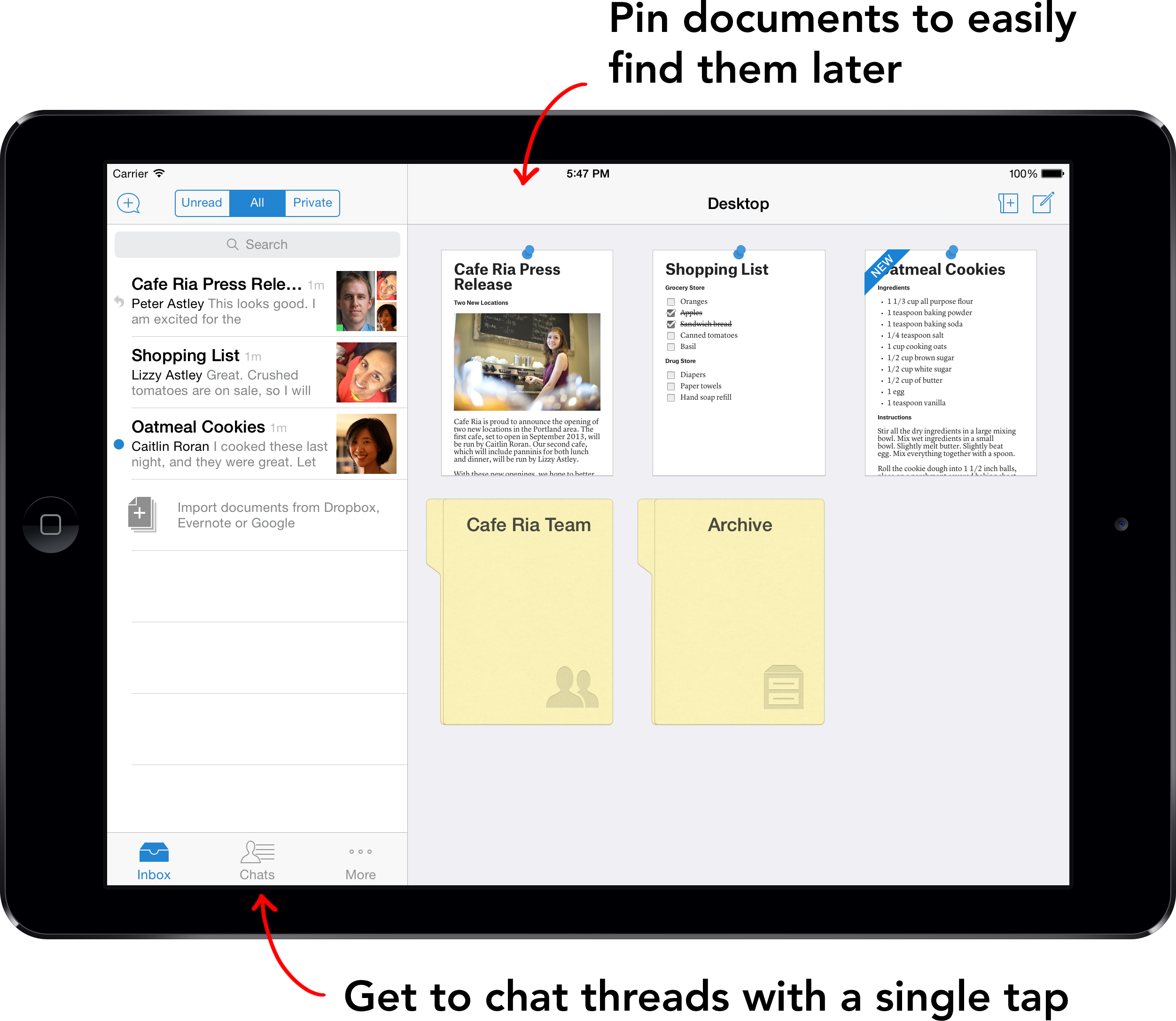 We've also introduced pinning. At the top of every document, you'll see a pin button, which adds the document your Quip desktop so it's easy to get back to later. It's a great way to add the two or three documents you care about to your Quip home screen so they don't get lost in your inbox, and it's just one tap away on any document.
