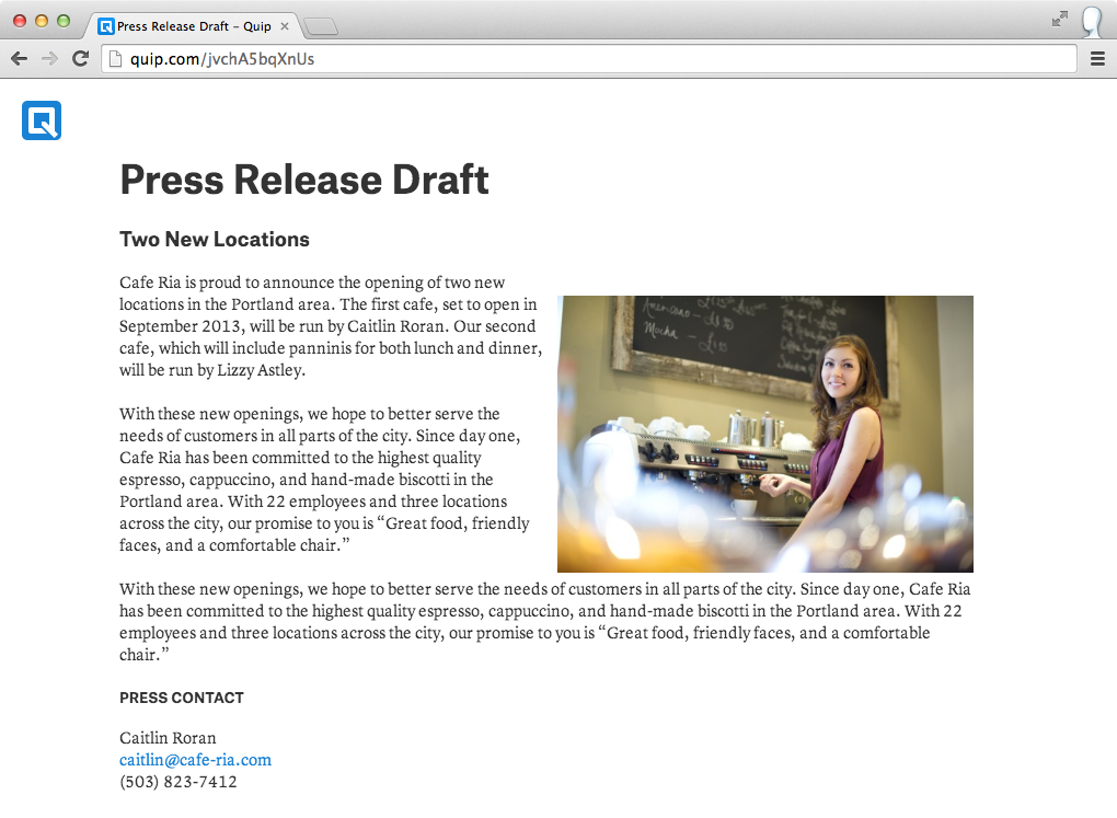 Quip supports a wide range of options for the links you publish so that you're in complete control of who can access it and what they can do. You can share a private link that anyone can edit, or you can create a view-only link that completely hides the Quip app so that your document is the only thing your audience sees. Here's what a published Quip document looks like to someone who's never used the app before — nothing distracts from the content in your document: