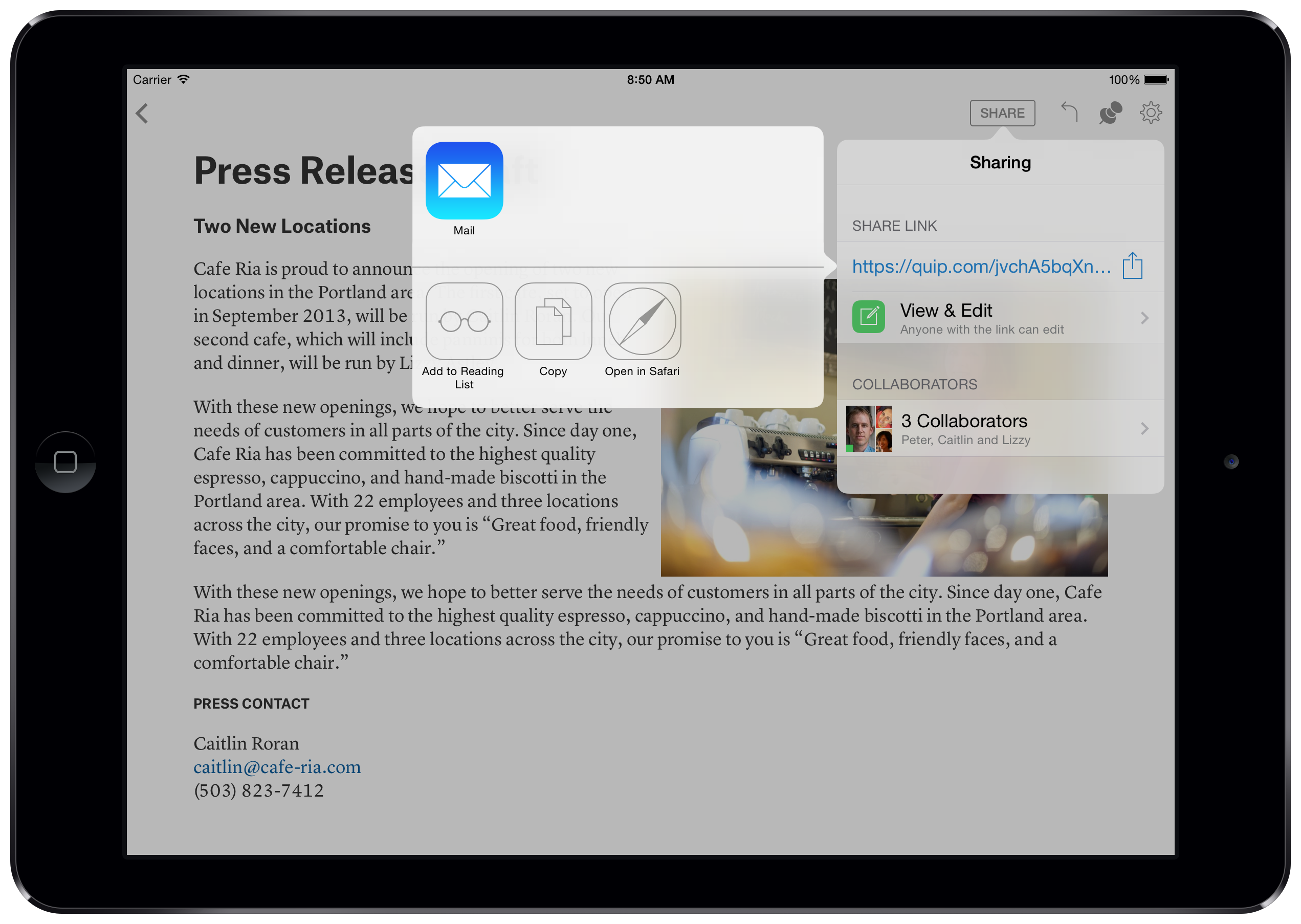 To share a Quip document, you can now send your colleagues a private link, and they'll be able to read it immediately — without installing the app or creating an account.