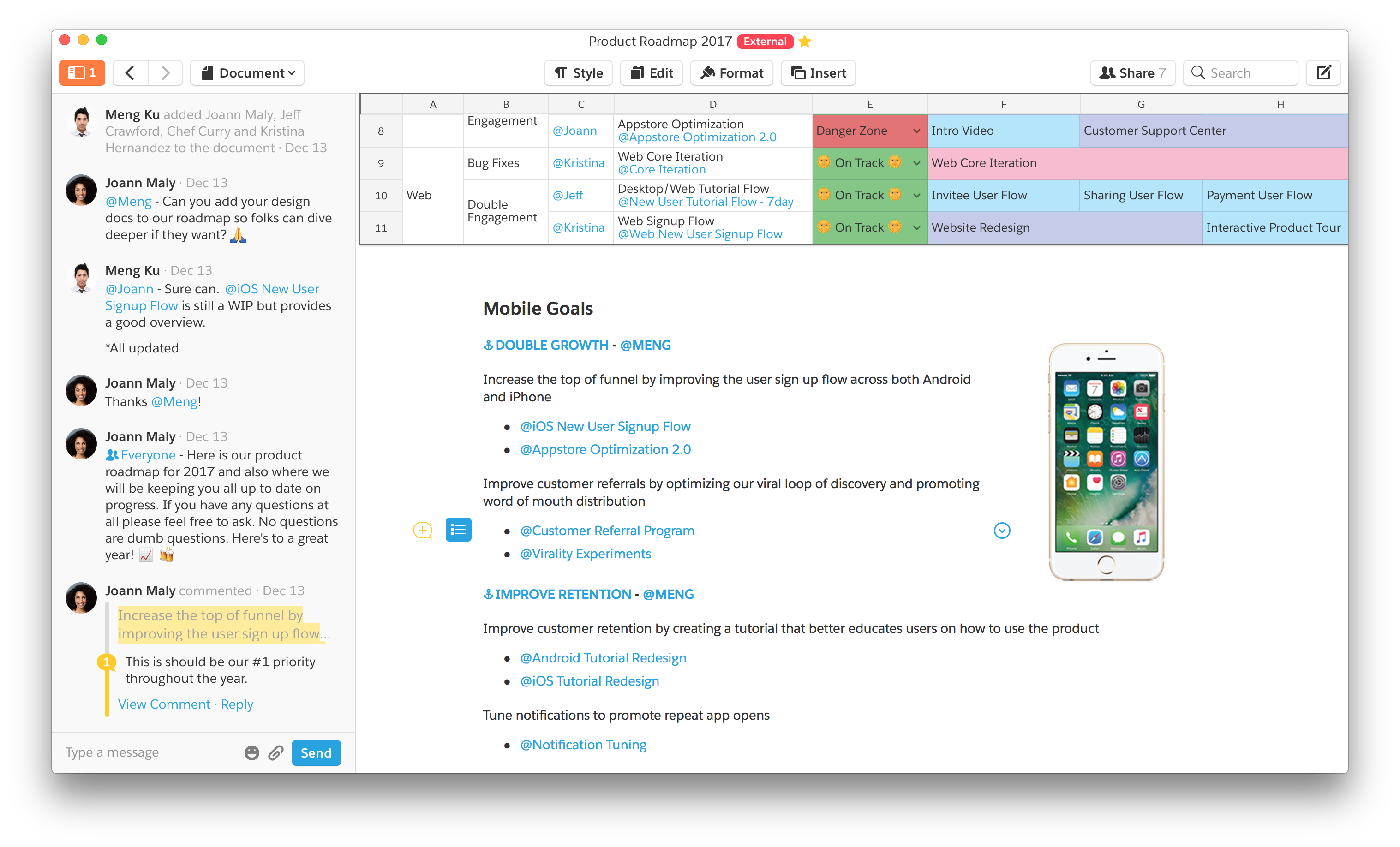 Technically speaking, you can use almost anything to build your roadmap. But in our (obviously biased) opinion, Quip is perfect for creating and sharing a product roadmap.