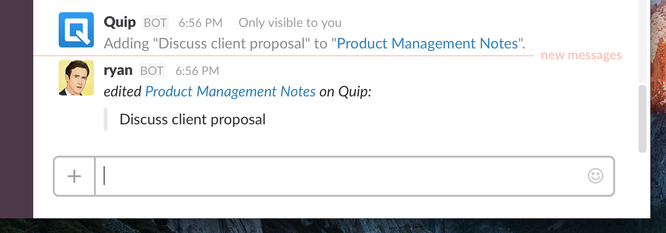 Quickly direct some notes in Slack into your notepad by typing /quip note Discuss client proposal to add the text "Discuss client proposal" to the channel notepad.
