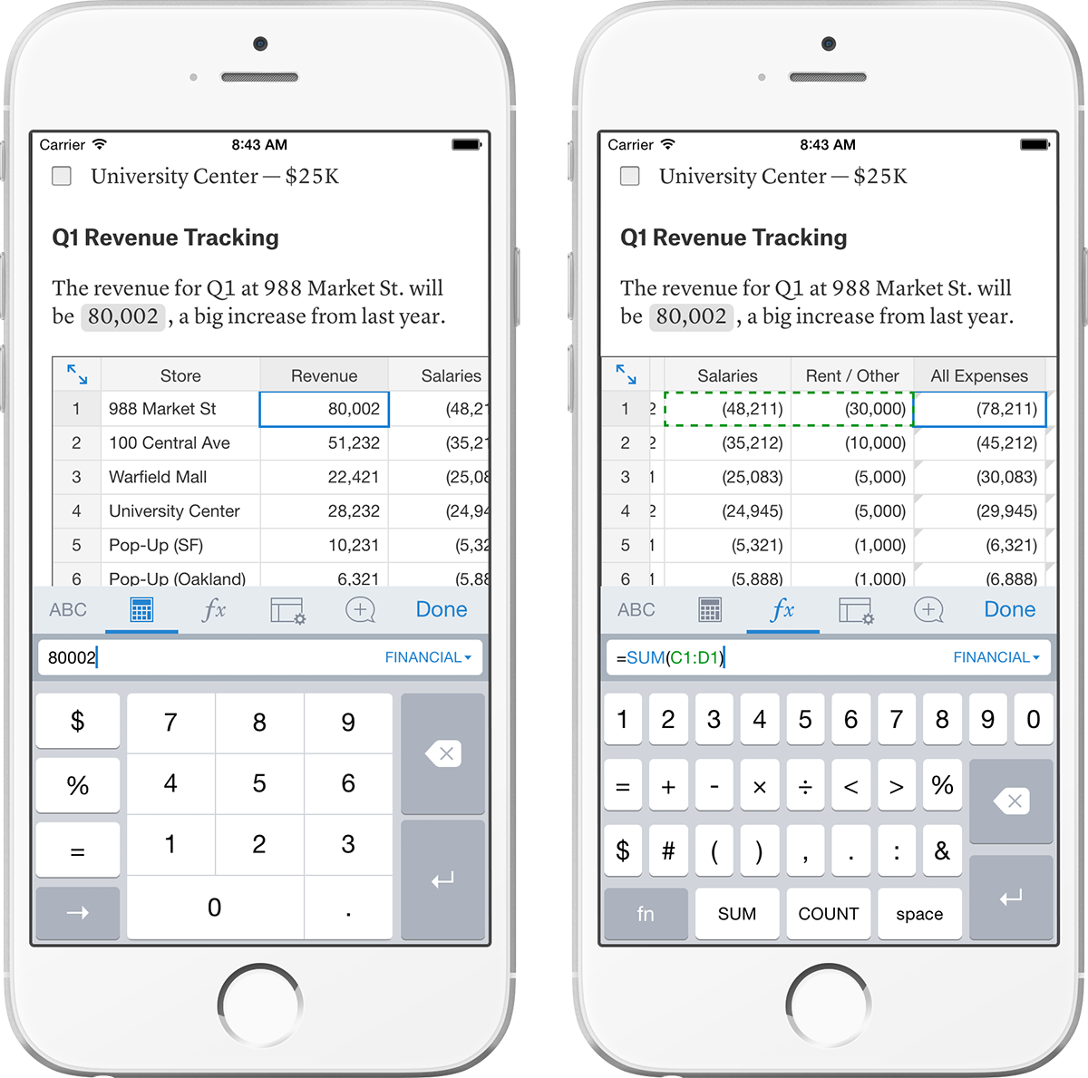 We designed a unique set of custom mobile keyboards that makes editing even the most complex spreadsheet a pleasure to do on the phone. When you're editing a table cell, you can choose between the keyboard built into your phone, a numeric keypad, and a specialized formula-editing keyboard: