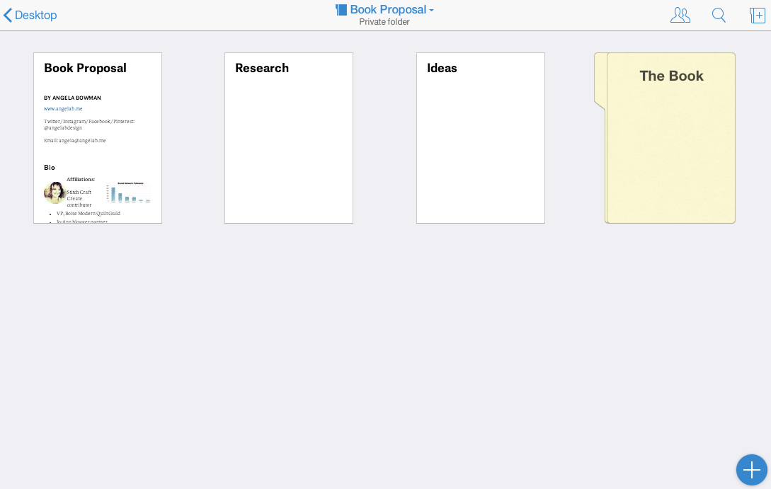 I'm also using Quip to work on a craft book proposal. To get the structure in place, I set up a private folder and added documents for the proposal, research, and ideas. Then I made a folder for the book itself. I'm just getting started, but I really like how it's working so far.