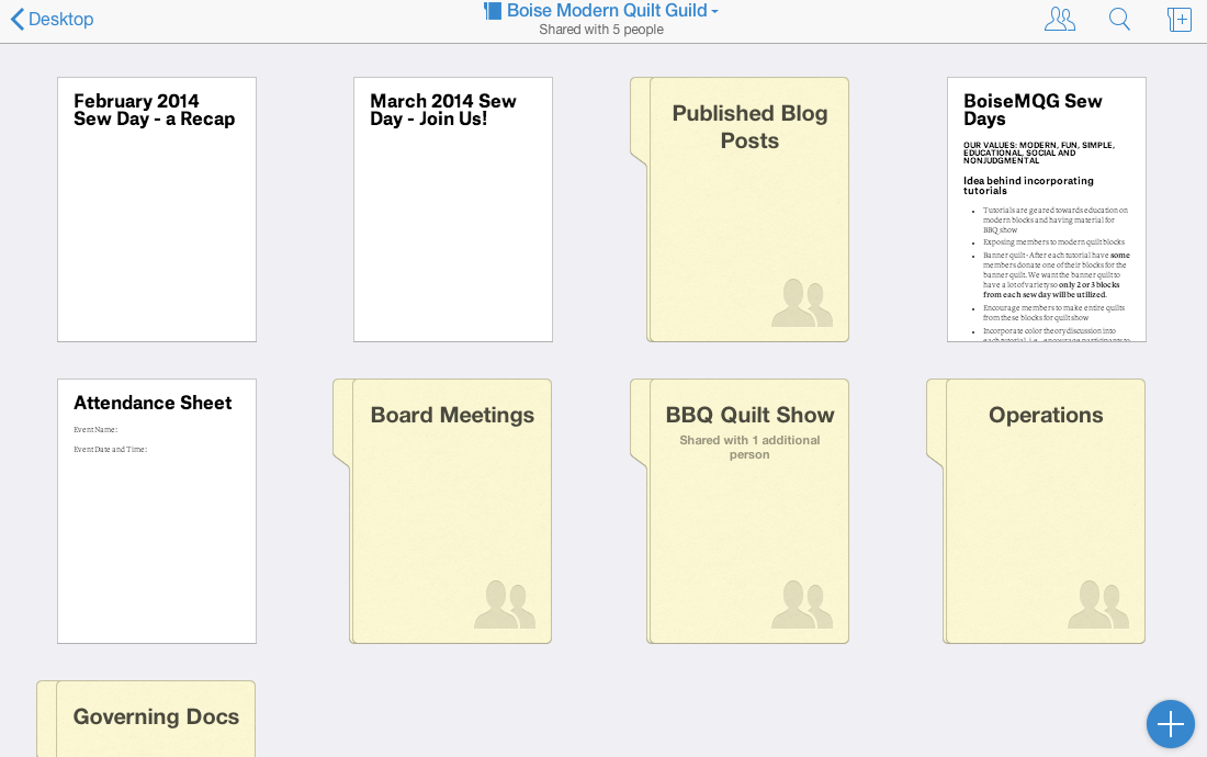 We simply have one folder shared by all board members. Quip's sharing features are so smooth - the permissions process in other word processing apps can be so cumbersome. Within that shared folder we organize blog posts, board meetings, governing docs, and more.
