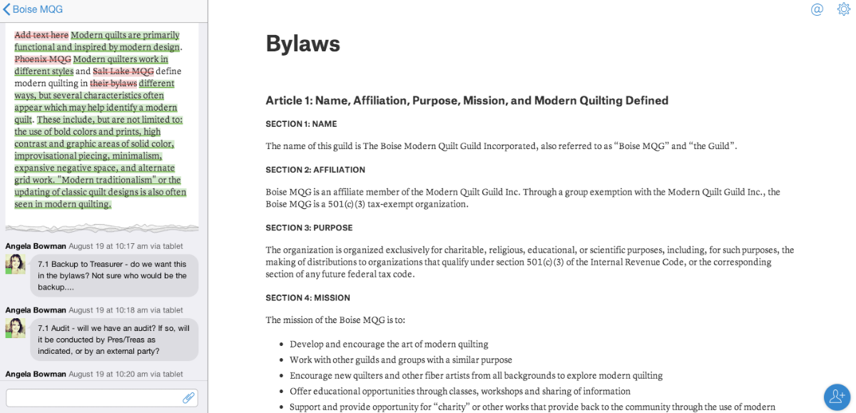 The main reason I started using Quip is because I needed to help the Boise Modern Quilt Guild become an official non-profit. Serving as one of the founding officers, I needed to work with three other people to prepare our governing documents, do some strategic planning, and come up with our online presence. Our board members are a group of women committed to developing and encouraging the art of modern quilting (and helllllo, we love to sew! ), but we are all very busy with work, home, and family. We don't have a ton of time to devote to the organization, and the time we DO devote.....well, we would like it to be fun.
